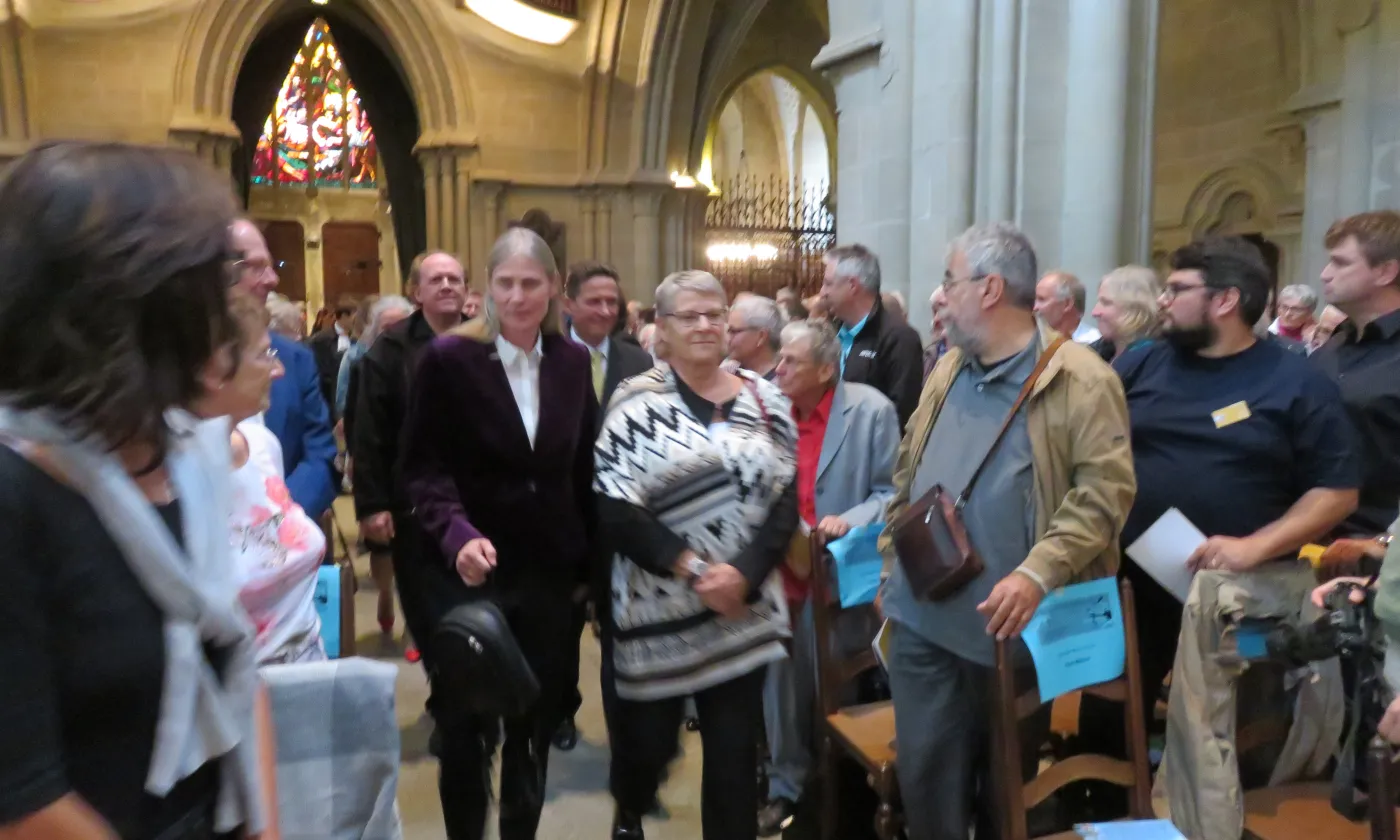 <div style="color: white;background-color: rgba(54, 171, 224, 0.5);">Le cortège d’entrée dans la cathédrale était mené par Sylvie Arnaud (à gauche) présidente du Synode de l’EERV et la conseillère d’État Béatrice Métraux, Cheffe du Département des institutions et de la sécurité</div>