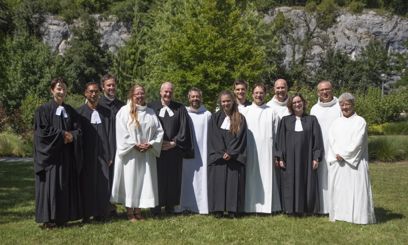 <div style="color: white;background-color: rgba(54, 171, 224, 0.5);">Les onze nouveaux ministres vaudois entourés des officiants du culte de consécration. (photo: EERV/GJaton)</div>