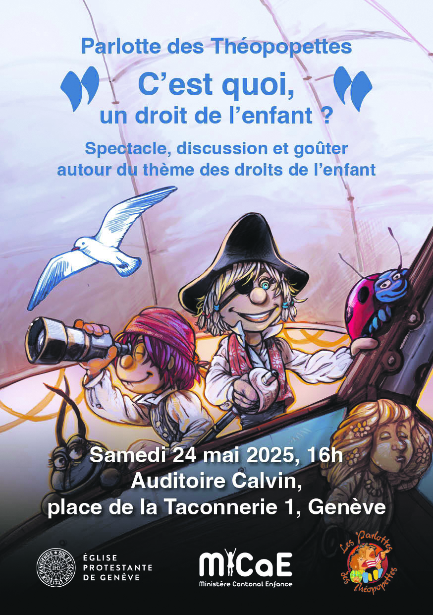 Dans le cadre de la Fête de l’Eglise protestante de Genève, une parlotte – un spectacle de marionnettes – avec Théo et Popette aura lieu le samedi 24 mai, à 16h, à l’Auditoire Calvin (place de la Taconnerie 1) sur le thème des droits de l’enfant.