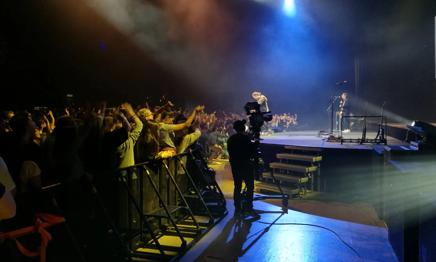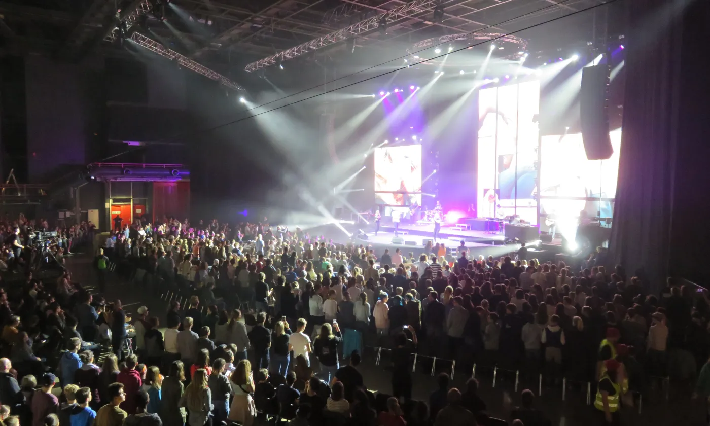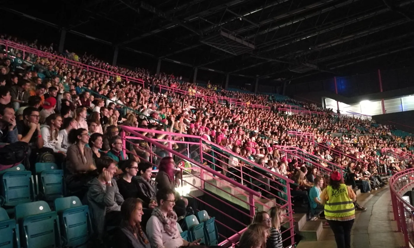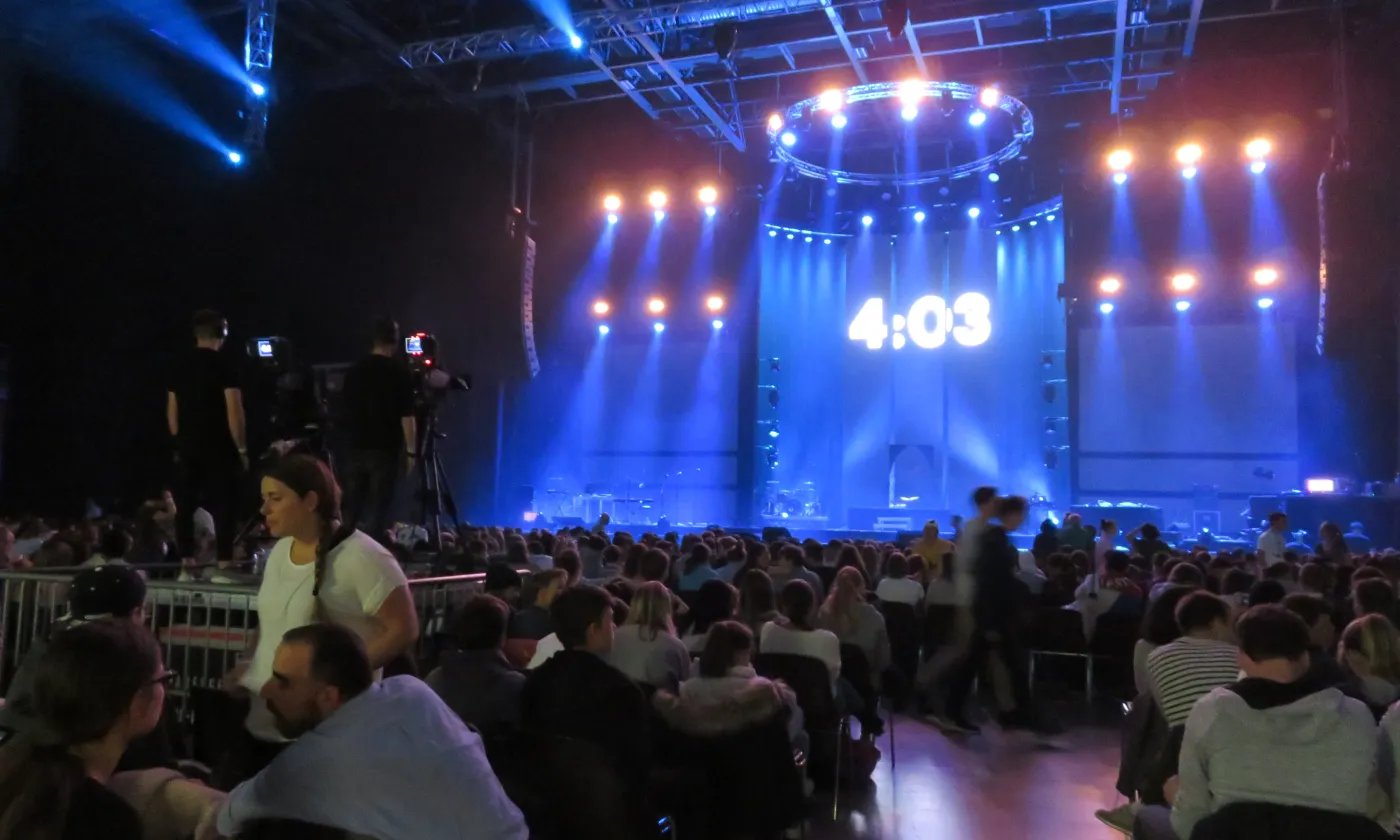 La chose se confirme en début d’après-midi. Les festivaliers et leurs accompagnants se retrouvent à l’Arena, une des plus grandes salles de concert de Genève à deux pas de l’aéroport. Derrière les portes tambour, c’est la cohue. Il faut montrer patte blanche. On tend son poignet, on montre son bracelet, avant de dévoiler le contenu de son sac au personnel de sécurité. On accède ensuite à un grand hall dans lequel flotte une odeur de churros et de crêpe au sucre. C’est là que se trouvent les stands missionnaires DM- échange et mission et Mission 21. Sur une petite estrade, une animatrice commente un match de «Bubble Soccer» tout en souhaitant la bienvenue aux nouveaux arrivants. «Welcome to Reformaction», répète-t-elle régulièrement dans un anglais aux intonations suisses allemandes. Dans un coin, une partie du staff finit d’installer la boutique à goodies de Switchfoot, le groupe de rock chrétien dont le concert débutera à la nuit tombée. On pénètre enfin dans la salle obscure où près de 4600 personnes sont en train de prendre place. Tout le monde est assis. Plus une chaise de vide dans le parterre. Les gradins sont assaillis. Sur un écran géant un chronomètre égrène les secondes jusqu’au coup d’envoi. «Füf! Vier! Drü! Zwöi! Eis!»: le public scande le décompte et le show, tel une montre suisse débute à 15h pile sous un tonnerre d’applaudissements et de cris stridents.