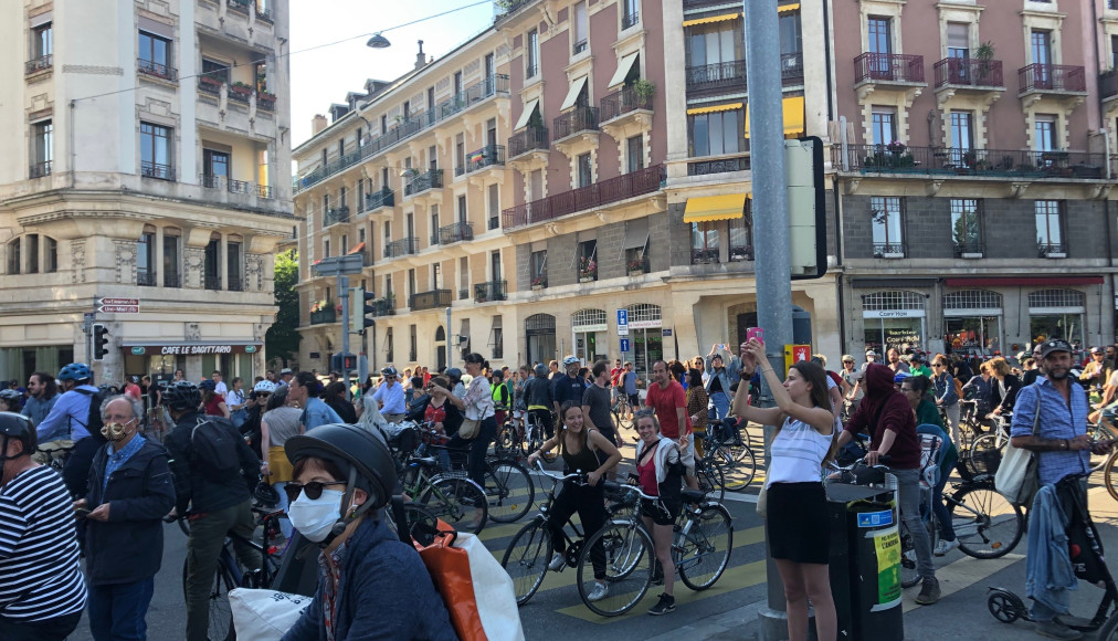 A la suite de métropoles européennes Genève a mis en place des mesures véritablement spectaculaires en divisant l’espace en deux entre voie pour les voitures et motos et voie pour les vélos sur des axes importants. C’est provisoire, et vu les réactions virulentes de politiques et figures publiques de droite, les milieux cyclistes, craignant un rétropédalage des autorités, ont lancé et une pétition qui devrait culminer prochainement à 15000 signatures, et une manifestation sur la plaine de Plainpalais où 2000 cyclistes ont effectué une boucle avec l’aide – il faut le souligner – des services de police qui ont joué les facilitateurs pour tenter d’éviter les confrontations avec les automobilistes.