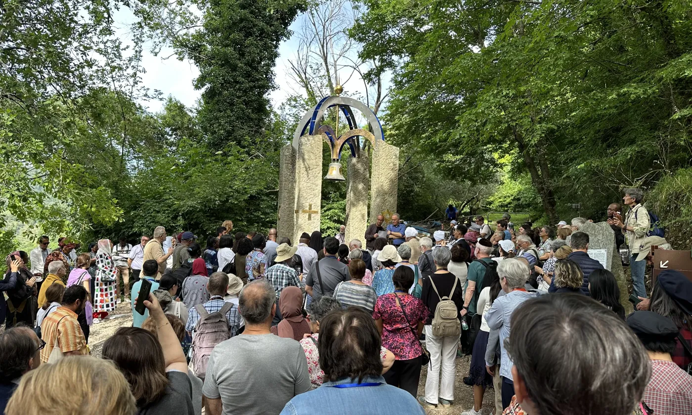Après la visite de la Basilique de Saint-François, le groupe se rend dans le « jardin de François », au pied d’un clocher « interreligieux », avec les symboles des diverses religions : la croix, l’étoile de David, le croissant, la roue du Dharma.