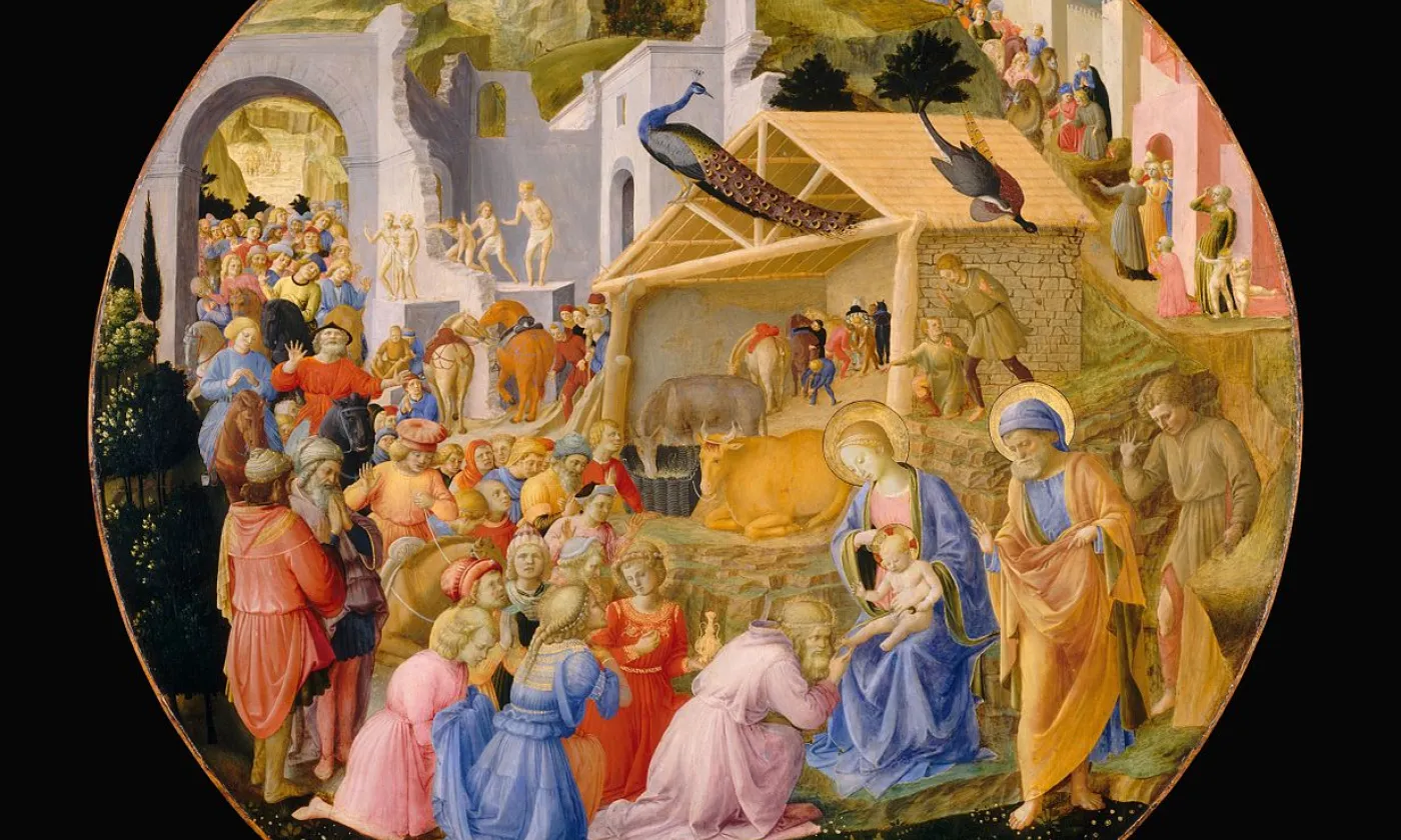 Dans le tondo, une peinture de l'Adoration des Mages par les peintres du XVe siècle Fra Angelico et Filippo Lippi, on trouve non seulement des moutons, un âne, une vache et un bœuf mais également un paon coloré qui regarde par-dessus la crèche pour apercevoir Jésus.