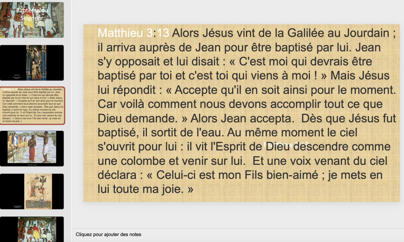 Le passage de Matthieu 3 raconte le baptême de Jésus par Jean. Lors du baptême une voix venant du ciel se fait entendre.