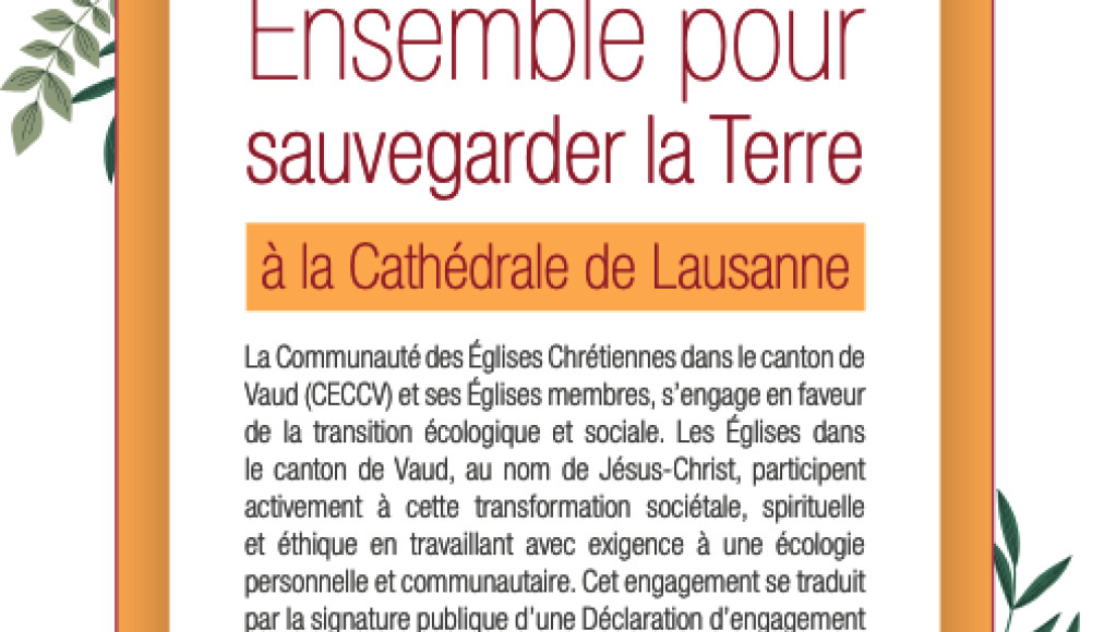 La Communauté des Églises chrétiennes dans le canton de Vaud (CECCV) et ses Églises membres, s’engagent en faveur de la transition écologique et sociale. Elles vous invitent toutes et tous, toutes générations confondues à partager et à soutenir cet engagement dimanche 2 octobre 2022 à la cathédrale de Lausanne.