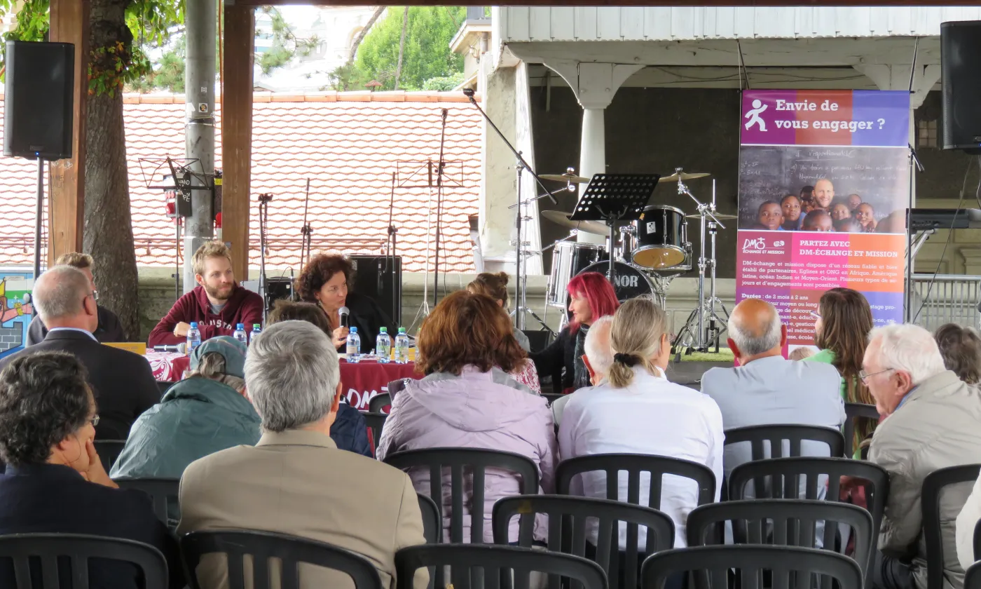 <div style="color: white;background-color: rgba(54, 171, 224, 0.5);">Devant l’édifice, une table ronde abordait la thématique de l’engagement. </div>