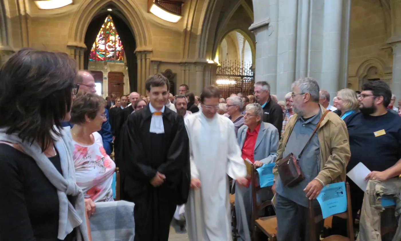 <div style="color: white;background-color: rgba(54, 171, 224, 0.5);">Le cortège d’entrée dans la cathédrale était mené par Sylvie Arnaud (à gauche) présidente du Synode de l’EERV et la conseillère d’État Béatrice Métraux, Cheffe du Département des institutions et de la sécurité</div>