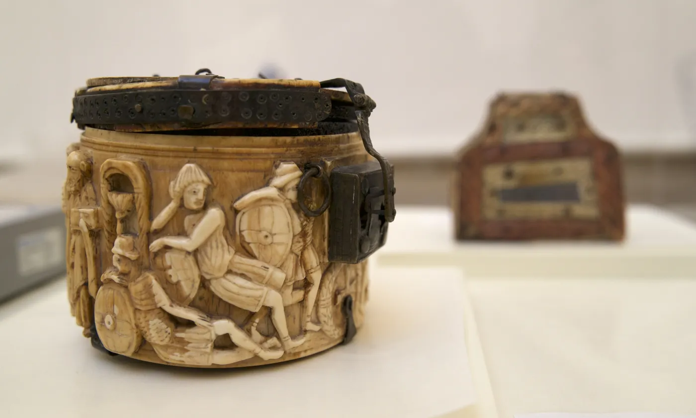 Une plaque-boucle en bronze représentant David dans la fosse aux lions, datant des VI-VIIe siècles. © Max idje Un coffret à hosties en ivoire, sur le thème des femmes aux tombeaux, datant du VIe siècle. © Max idje Une paire de fibules, épingles à vêtement, ornées de grenats. © Max idje Stèle de calcaire. © Max idje Recueil de textes de droit ecclésiastique conservé dans les Archives du Chapitre de Sion, réalisé au IXe siècle. © Max Idje Previous Next cultureLumière sur le Haut Moyen ÂgeMarie Destraz4 février 2020Dans l'exposition «Aux sources du Moyen Âge, 350-1000», au Palais de Rumine à Lausanne, six siècles se dévoilent à coup d'objets sortis des tombes.