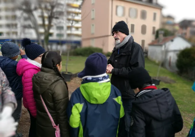 Des enfants du collège de la Planta ont installé les premiers arbres fruitiers du nouveau verger autour du temple de Chavannes-près-Renens (VD), mardi 20 mars. Un projet paroisse-commune qui vise à promouvoir le lien social autour des espaces verts et des jardins participatifs.